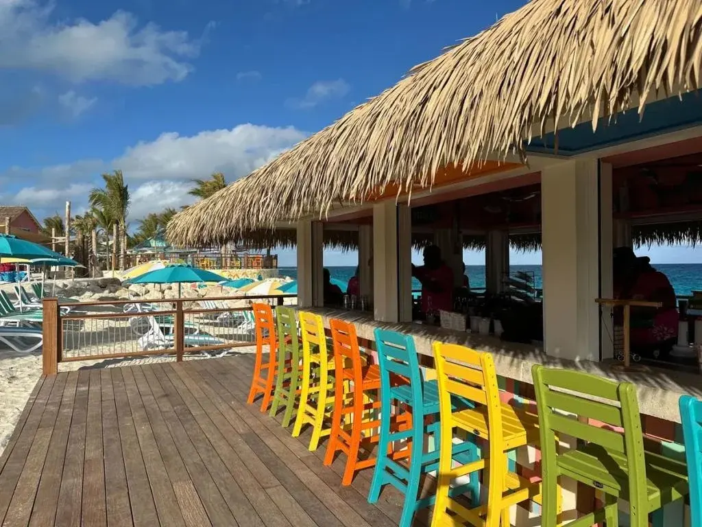 Tàu cập bến gần Chill Beach và dành phần lớn thời gian ở đó và tại hồ bơi liền kề. Chúng tôi tìm được một chiếc ghế dài đôi có dù che và ngay lập tức được một nhân viên phục vụ chào đón và nói rằng cô ấy sẽ hỗ trợ chúng tôi. Cô ấy rất tuyệt, và mặc dù có nhiều quầy bar và khu tự phục vụ đồ uống, nhưng sự có mặt của nhân viên phục vụ vẫn là một điểm cộng.